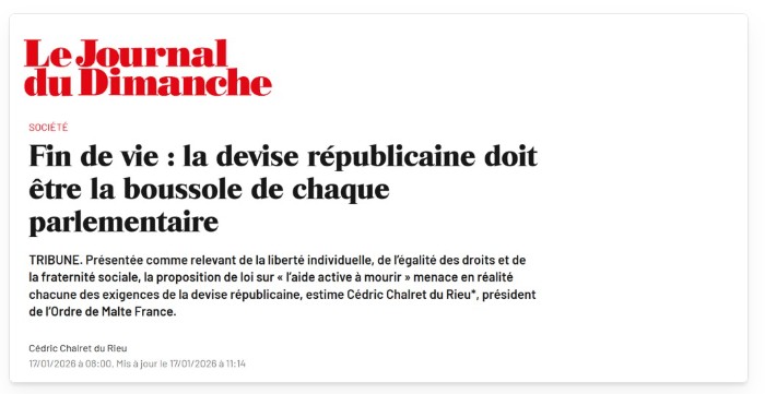 Vous êtes également invités à lire le point de vue exprimé par Cédric Chalret du Rieu, Président de l'Ordre de Malte France, dans le Journal du dimanche : (cliquer sur l'image pour accéder à l'article)