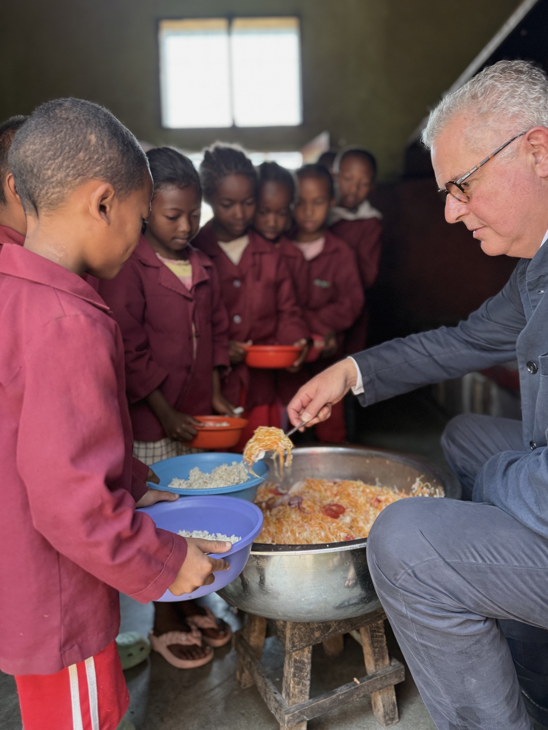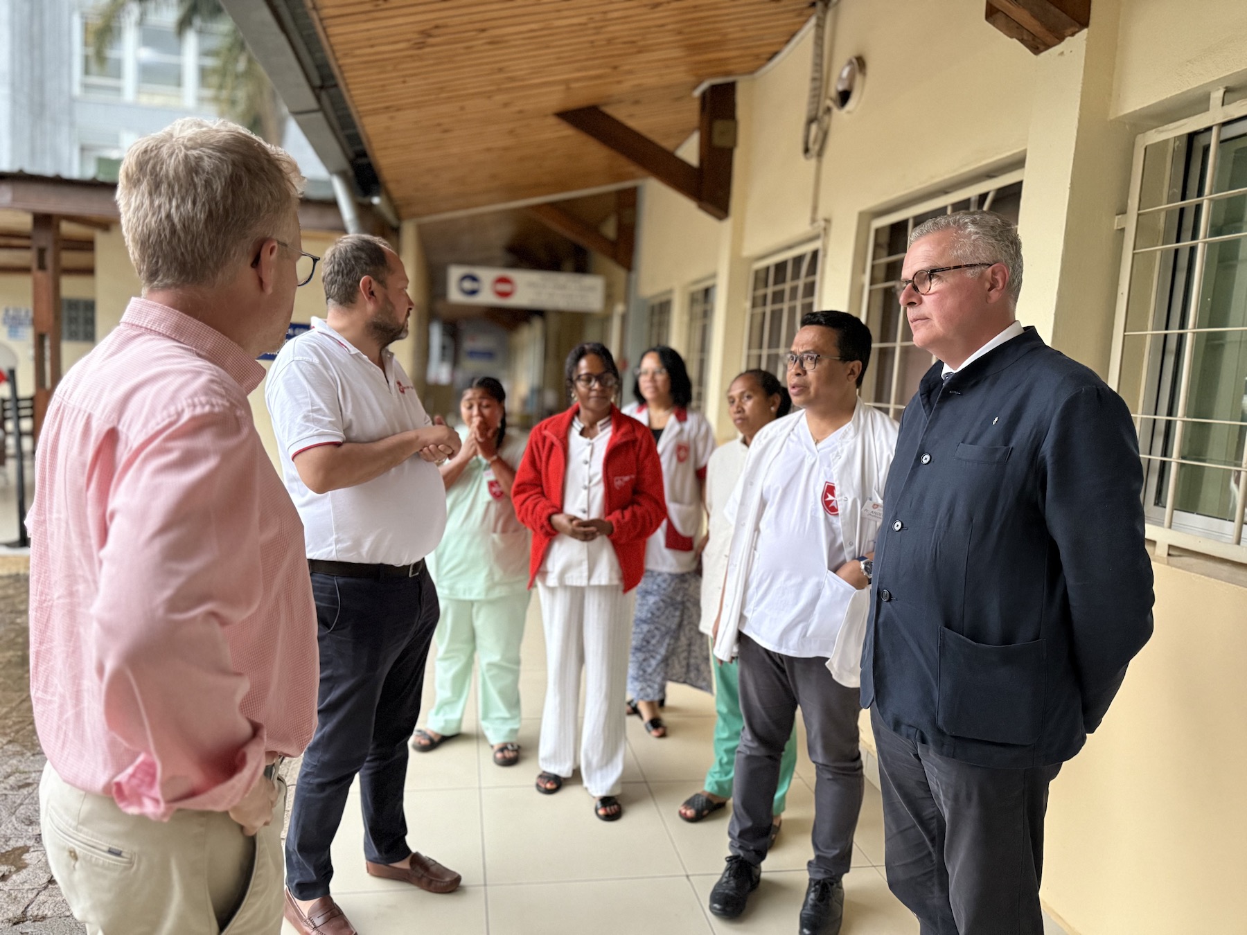 L’Ordre de Malte a établi des relations diplomatiques avec Madagascar en 1990 et est actif dans le pays depuis des décennies avec des initiatives sanitaires et sociales. L’activité phare de l’Ordre, gérée par Ordre de Malte France (OMF), est le Pavillon Sainte Fleur, une maternité ouverte en 1999 au sein du centre hospitalier universitaire d’Antananarivo. Fra’ Emmanuel Rousseau s’est rendu à l’unité de néonatologie pour s’informer de près du travail des équipes locales dans les soins aux nouveau-nés prématurés, ainsi qu’au Centre de santé Ambodirano, dans l’un des quartiers les plus pauvres d’Antananarivo, tenu par les Petites Sœurs de l’Evangile. L’Ordre de Malte France gère en effet un programme d’assistance sanitaire impliquant 14 centres de santé partenaires, pour améliorer l’accès aux soins materno-infantiles dans les zones les plus pauvres du pays, et dont le Centre de santé Ambodirano fait partie. Un moment de profonde spiritualité et de service illustratif du charisme de l’Ordre — tuitio fidei et obsequium pauperum — a eu lieu lors de cette visite, avec la Messe et la distribution de repas aux écoliers pauvres, en compagnie des sœurs de la communauté.